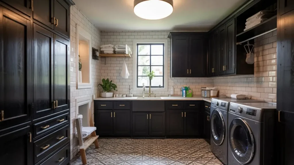 There is something undeniably cool and commanding about matte black. It doesn’t reflect light; it absorbs it, giving it a soft, velvety appearance that feels incredibly modern and sophisticated. Making matte black cabinets the focus of your laundry room is a power move.