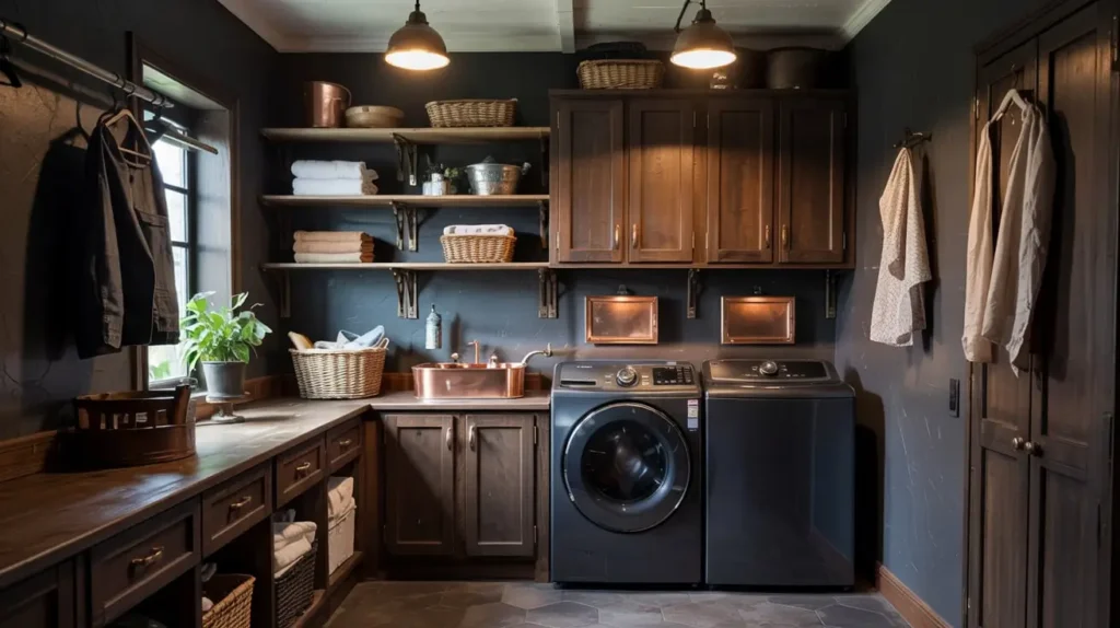 If navy is the sophisticated older sibling, charcoal is the cool, artistic cousin who listens to indie music. A charcoal gray laundry room is modern, a little bit edgy, and effortlessly chic. Paired with the fiery warmth of copper, it creates a dynamic that is both industrial and incredibly inviting.
