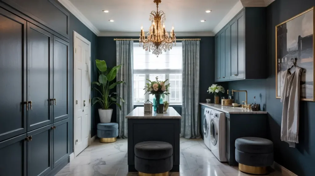 For the person who loves drama but hates clutter, a midnight blue minimalist laundry room is the answer. This look is about the power of a single, profound color in a clean, uncluttered space. It’s sleek, modern, and has a quiet confidence.