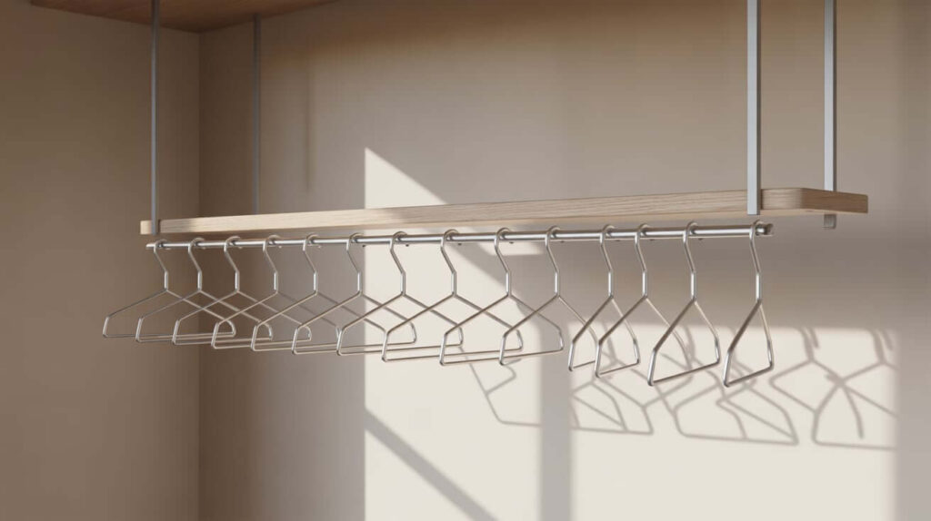 Let’s end with a solution that is endlessly versatile, stylish, and perfect for narrow walls: the suspended peg rail system. This is a modern, minimalist take on the classic Shaker peg rail. But instead of mounting it directly to the wall, you suspend it from the ceiling using leather straps or ropes.