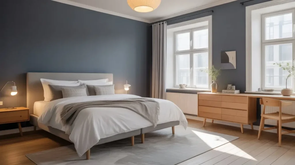 Scandinavian design principles—simplicity, functionality, and coziness—pair beautifully with navy blue. This combination creates a bedroom that feels warm and inviting while maintaining that clean, uncluttered aesthetic Scandinavian design is famous for.