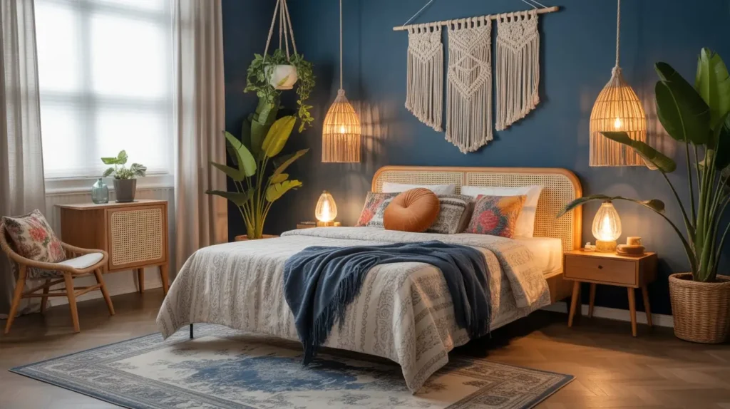 Your navy blue can appear in various ways here—maybe it’s your bedding, perhaps it’s painted furniture, or possibly it’s a major wall color that anchors everything else. The beauty of boho style is its flexibility.