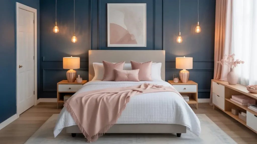 The contrast between deep, sophisticated navy and soft, romantic blush pink creates visual tension that’s both calming and visually interesting. Neither color overwhelms the other—they balance perfectly.