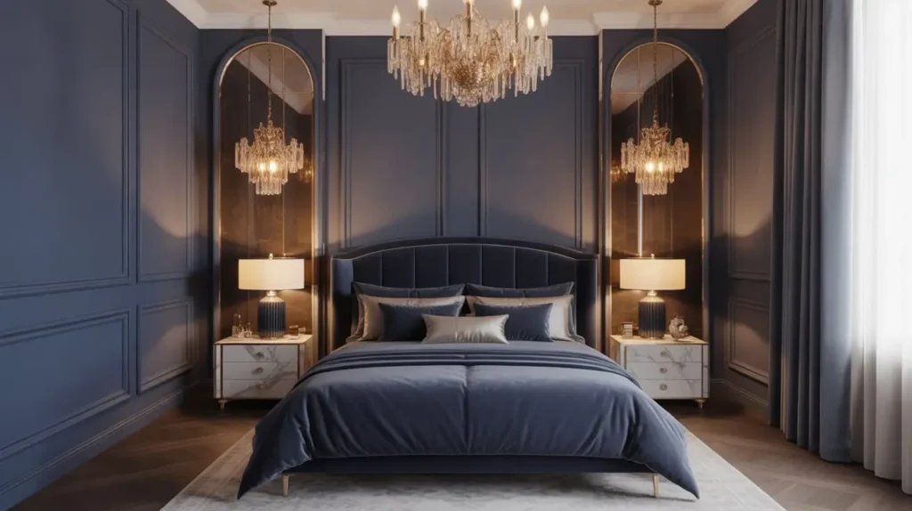 Want your bedroom to feel like a five-star hotel suite without actually spending five-star prices? The navy blue and gold combination delivers luxury vibes on a realistic budget. This pairing screams sophistication, and honestly, it never goes out of style.