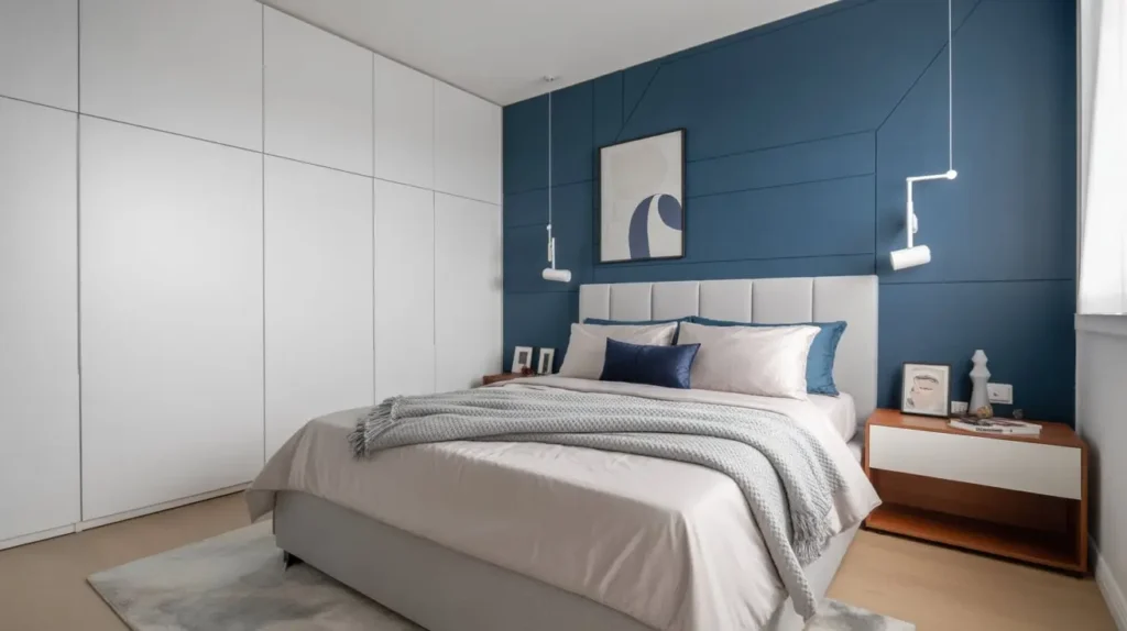 I helped my sister transform her 10×10 bedroom using navy blue, and the results were honestly shocking. She painted the wall behind her bed navy and kept the remaining walls in a soft gray. Combined with white bedding and good lighting, the room felt sophisticated rather than suffocating.