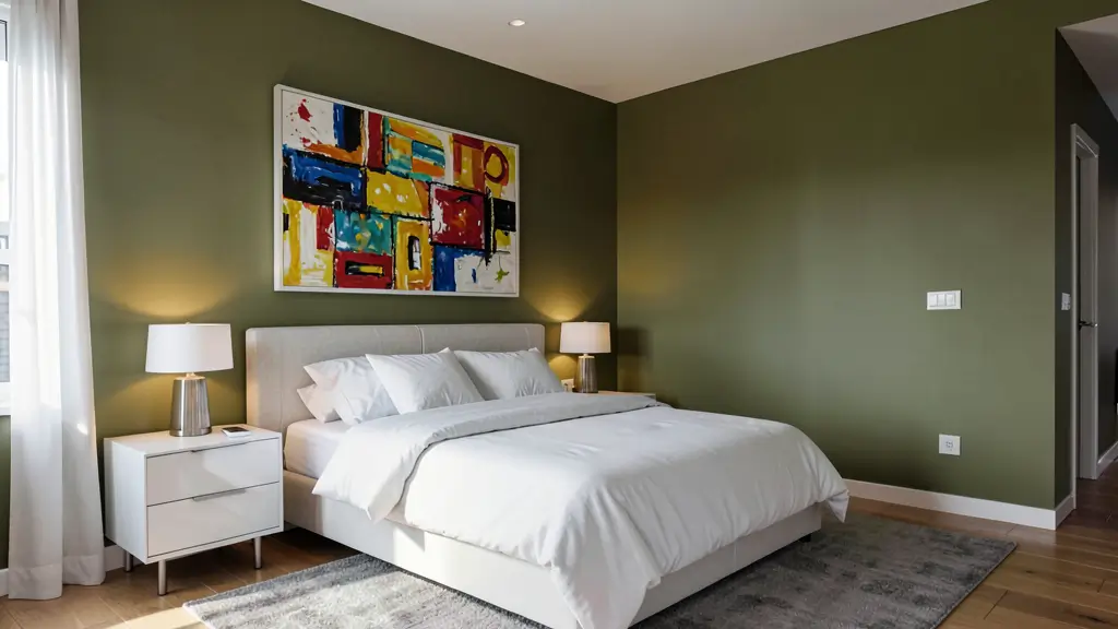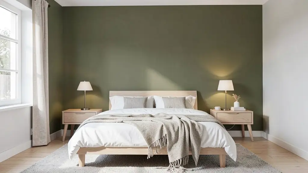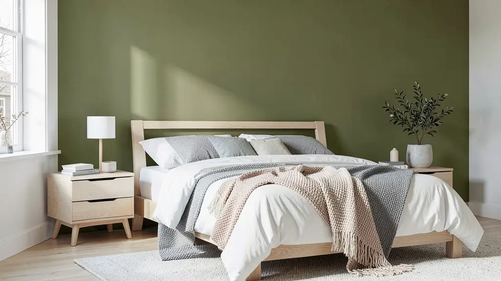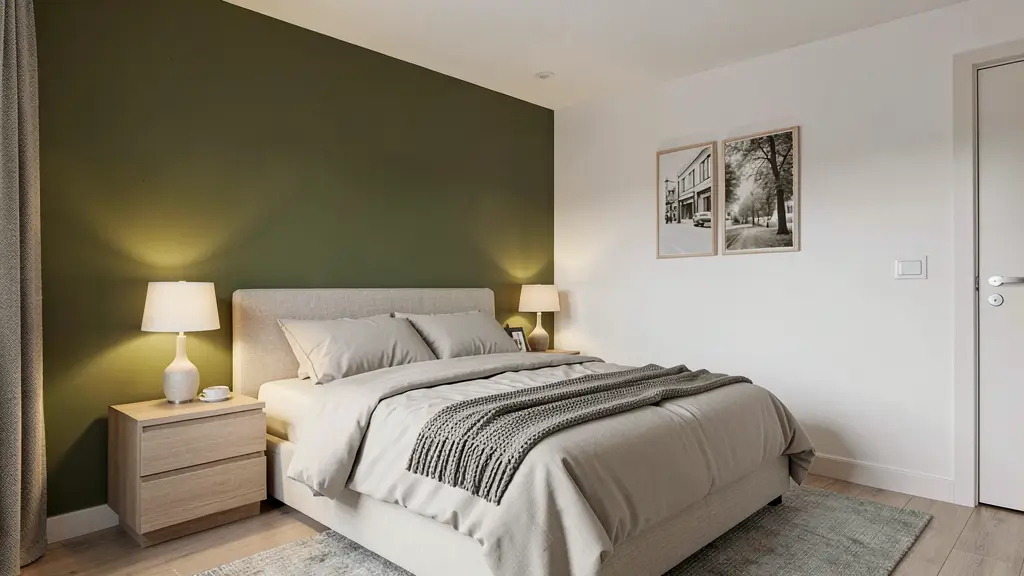 Balance your olive accent wall with neutral walls in cream, white, or soft gray. This prevents the room from feeling too dark while still making a statement.