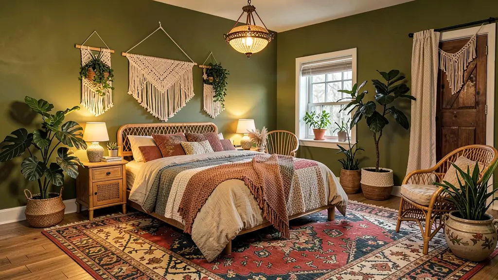 Mix patterns fearlessly â€“ pair olive green with warm terracotta, mustard yellow, and cream. Think Moroccan-inspired prints, macrame wall hangings, and plenty of layered textiles.