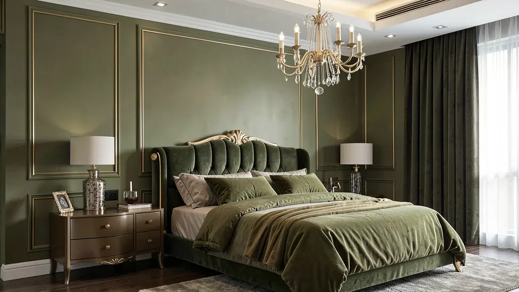 Want to feel like royalty every time you enter your bedroom? The olive green and gold combination is pure luxury magic.