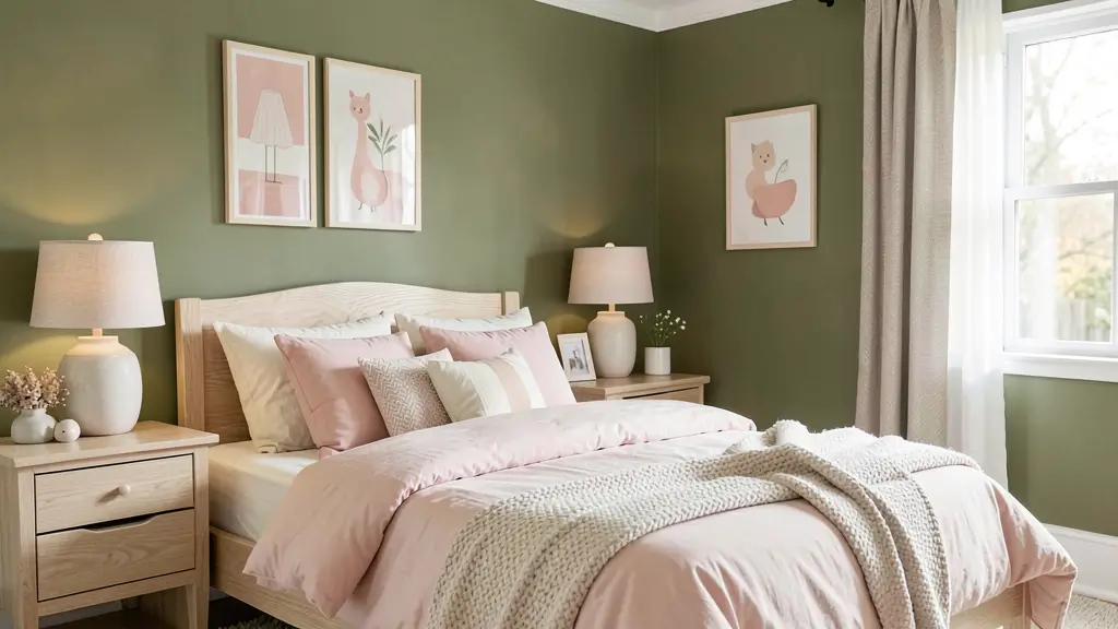 Want to soften olive green’s earthy intensity? Pair it with gentle pastels for a dreamy, romantic bedroom that still feels grounded.