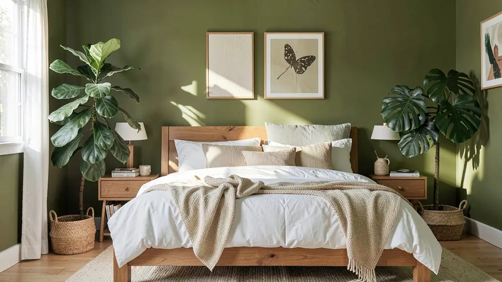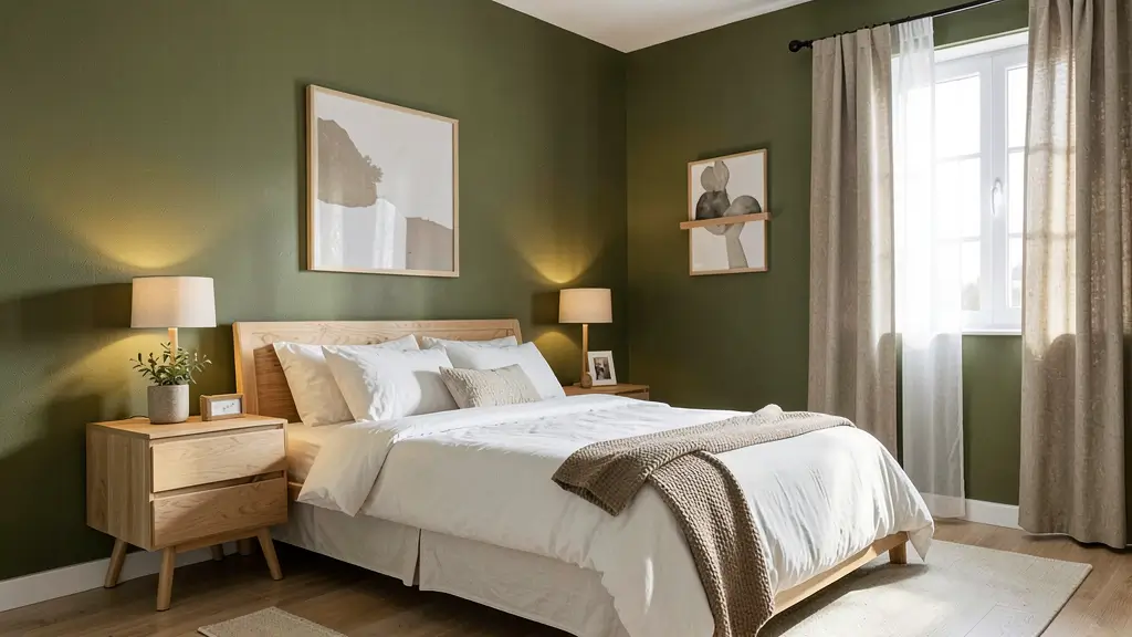 Pair your olive walls with crisp white trim and neutral bedding. Think cream, beige, and soft grays. This combination prevents the room from feeling too dark while letting the green take center stage.