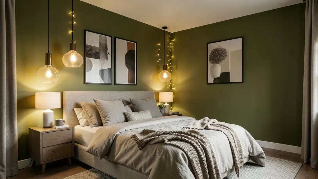 Focus on quality over quantity. A single statement piece, like an olive green upholstered bed frame or a carefully chosen artwork, makes more impact than multiple smaller items.