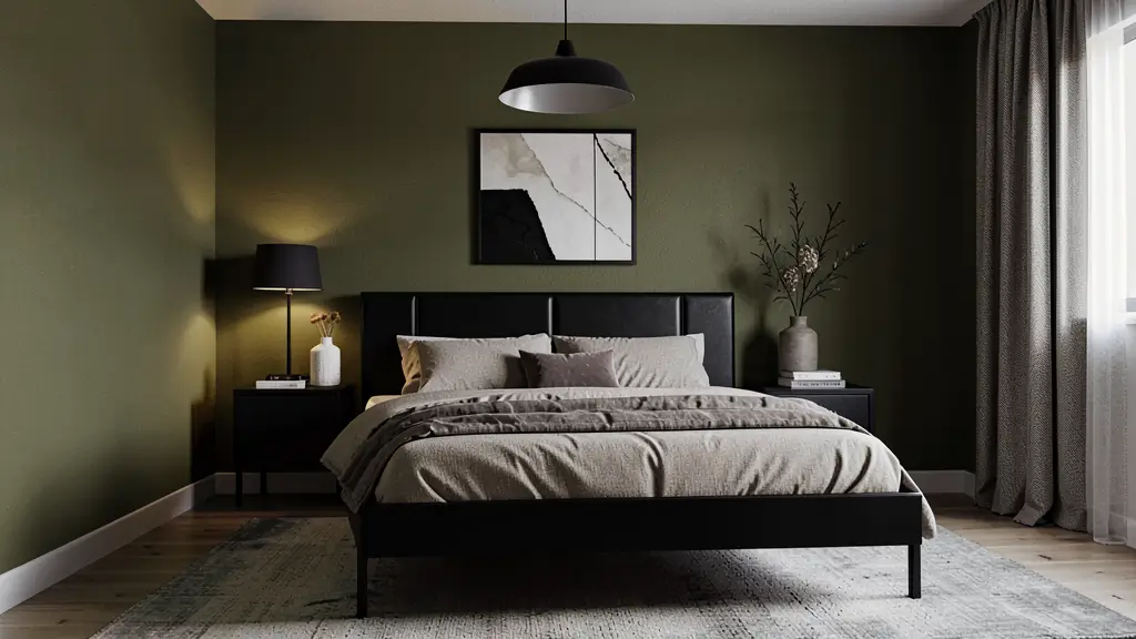 Use black as an accent color rather than the dominant shade. Black picture frames, lamp bases, and hardware create crisp contrast against olive green walls or bedding.