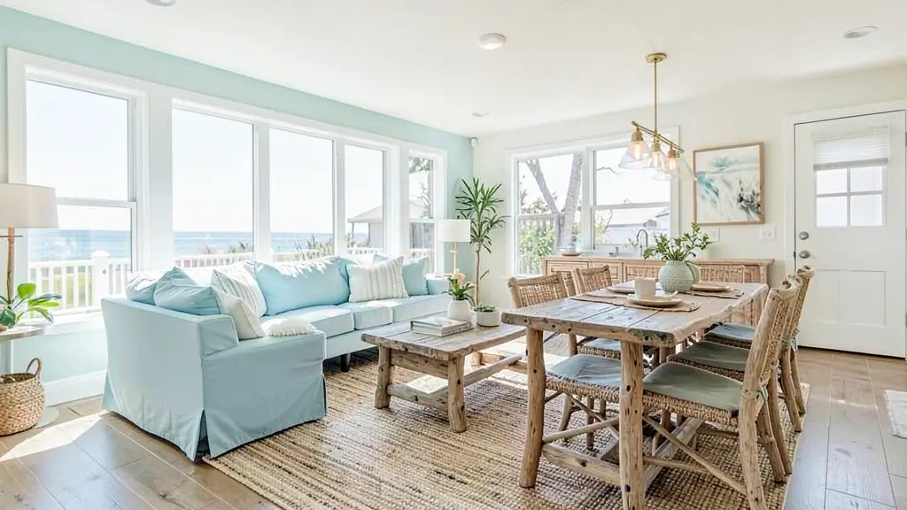 Coastal design in open layouts emphasizes airiness, natural light, and a connection to nature. The color palette sticks to ocean-inspired hues: blues ranging from sky to navy, sandy beiges, driftwood grays, and crisp whites.