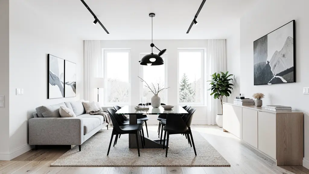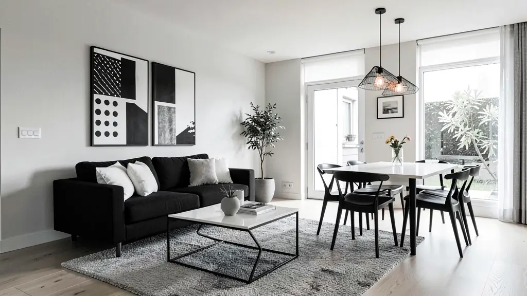 Don’t forget about warmth. Introduce natural wood tones, brass or gold accents, and greenery to prevent your space from feeling like a photography studio. A warm wood dining table between black and white elements grounds the whole room.
