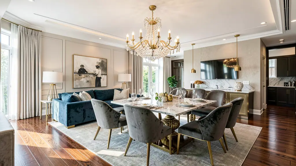In a luxurious open concept, the transition between living and dining should feel seamless and polished. Think high-end materials, statement furniture, and those finishing touches that make guests quietly wonder how much you spent. (You don’t have to tell them.)