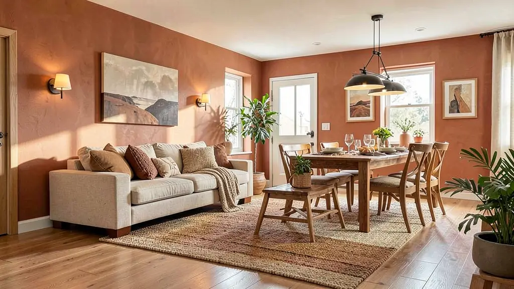 In an open concept living and dining room, earth tones create a cohesive, grounded atmosphere. These colors naturally complement each other (because they literally come from the same earth palette), making it easy to transition between zones without jarring color shifts.