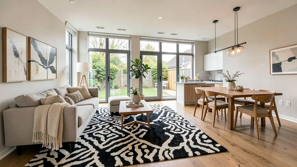 For the dining area, your rug must accommodate chairs pulled out. Measure your table, add about 24-30 inches on each side, and that’s your minimum rug dimension. People scraping chair legs off rug edges during dinner is deeply annoying.