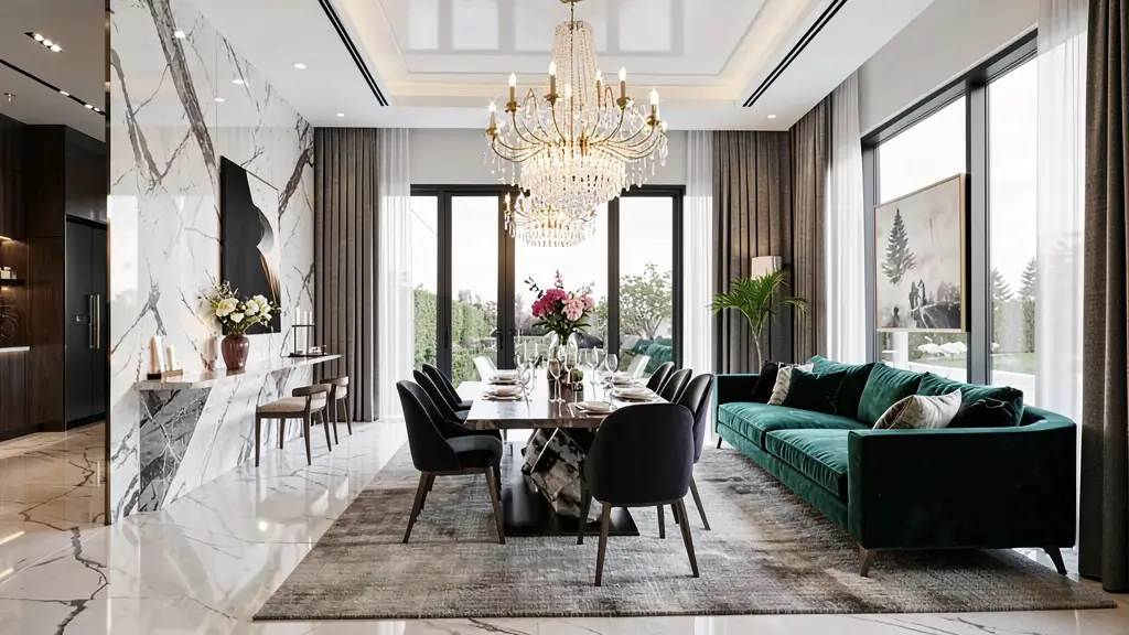 I’ve seen stunning open concepts where a deep emerald green sofa in the living area connects to emerald dining chairs, with brass accents tying everything together. The color becomes the thread that weaves the spaces into one cohesive story.