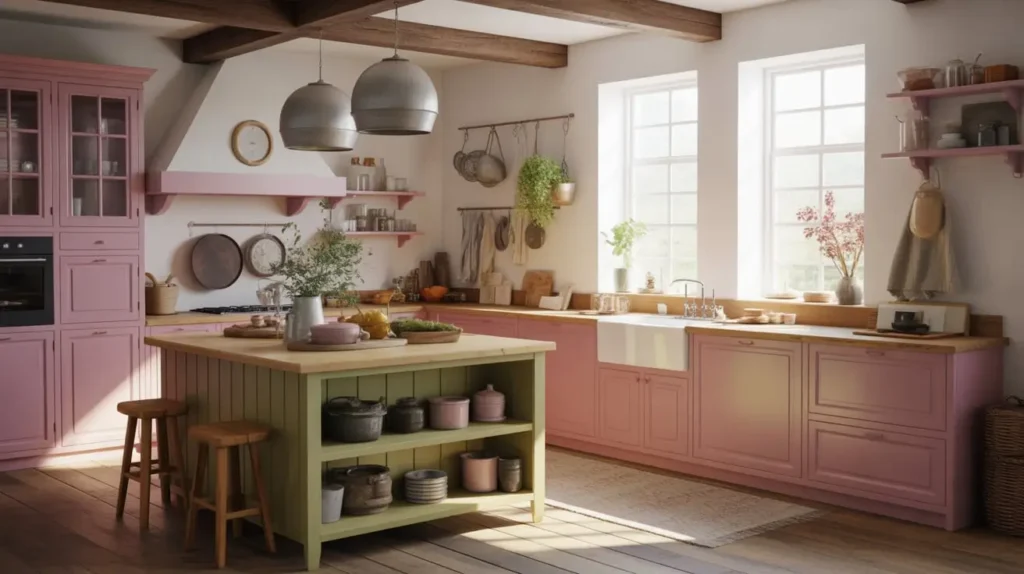 If your dream kitchen is a place where bread is always rising, herbs are drying in the window, and friends feel instantly at home, then a rustic style is for you. This isn’t about perfection; it’s about warmth, texture, and a sense of history. Pink and green fit beautifully into this aesthetic, lending it a soft, pastoral charm.