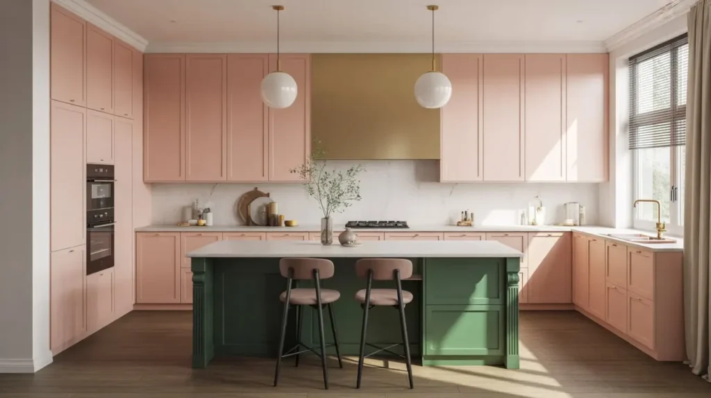 This is one of my favorite ways to balance light and dark. It’s a high-contrast look, but because the colors are so beautiful, it feels harmonious rather than jarring. Imagine an entire wall of cabinets painted in a soft, elegant blush pink. This makes the kitchen feel bright, open, and welcoming.