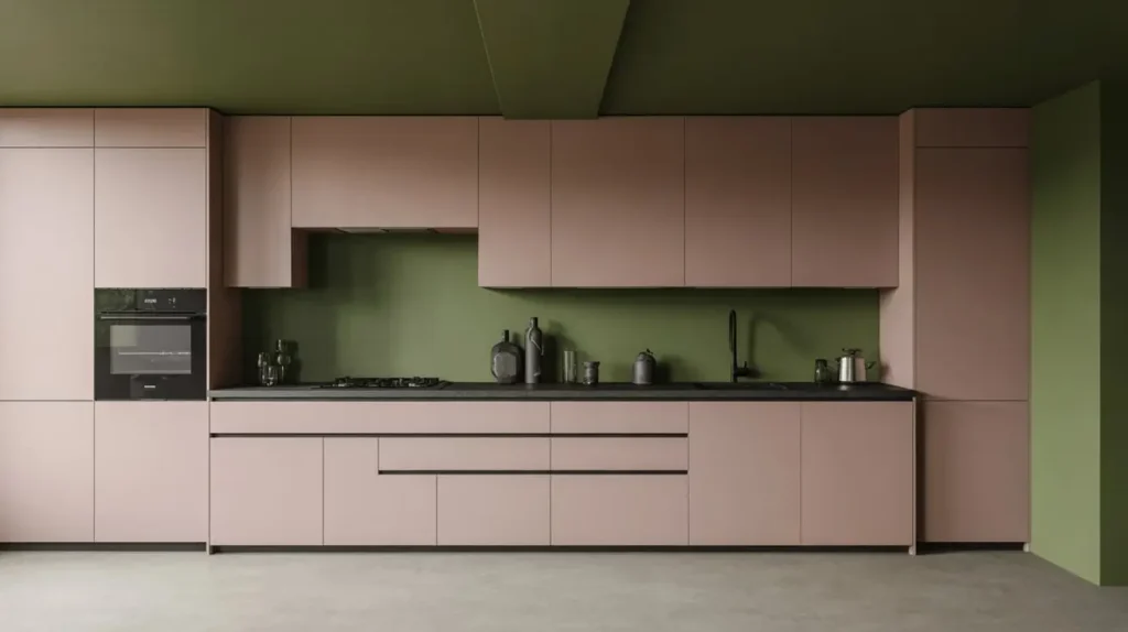 To nail this look, I’d recommend focusing on matte finishes. A matte blush on the cabinets hides fingerprints (a serious win) and feels incredibly high-end. For the green, you could use large-format sage tiles for a seamless look or even paint the wall behind your open shelving.