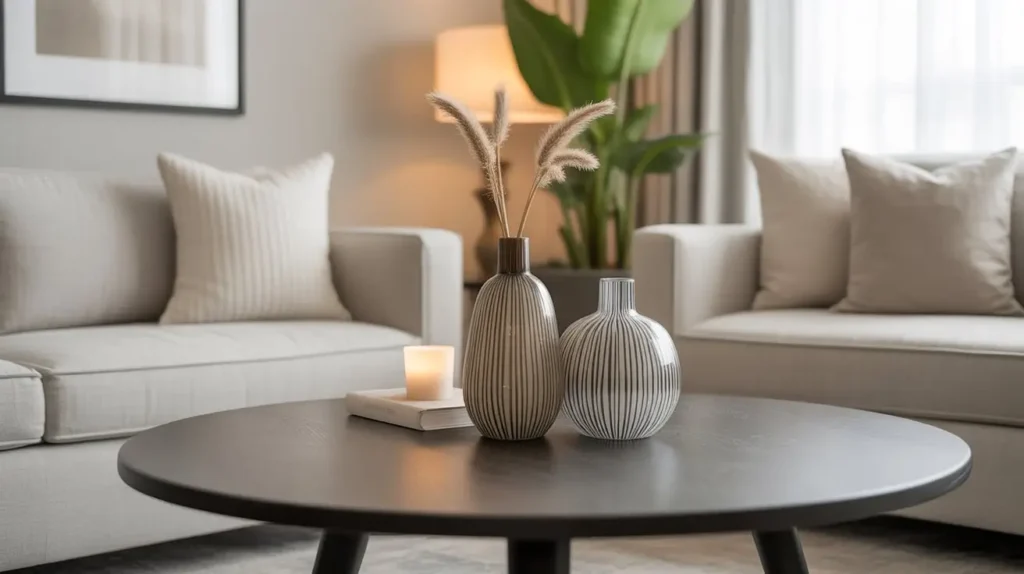 On a round table, placing two matching vases side-by-side or opposite each other (with a small item in the middle) creates a look that feels balanced, intentional, and elegantly composed.