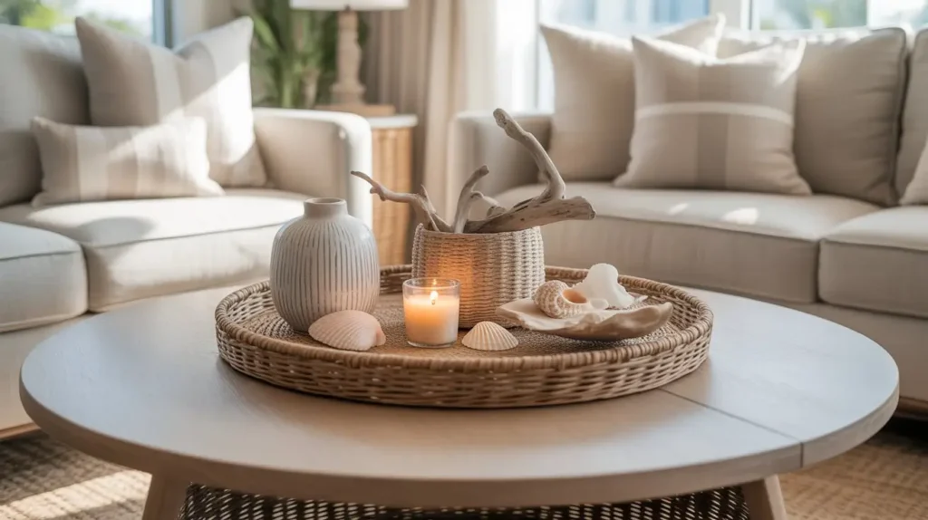 - Woven Textures are a Must: Incorporate a shallow woven basket or a tray made of rattan, seagrass, or water hyacinth. This is the foundation of the coastal look.