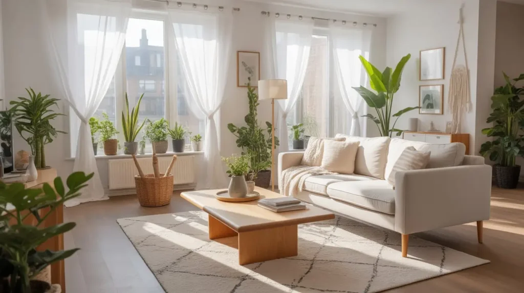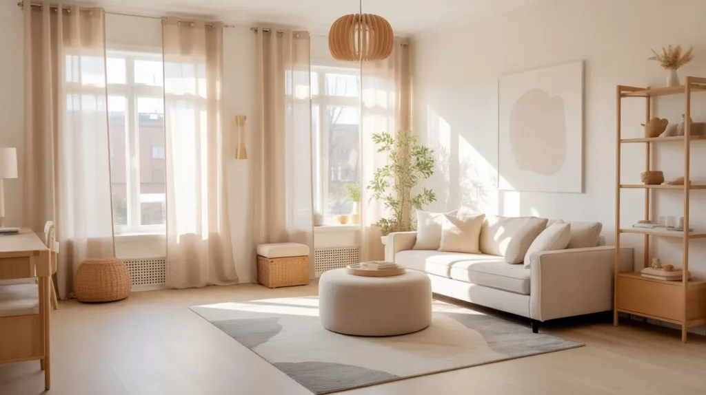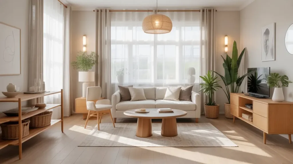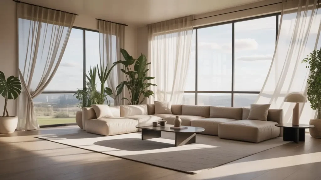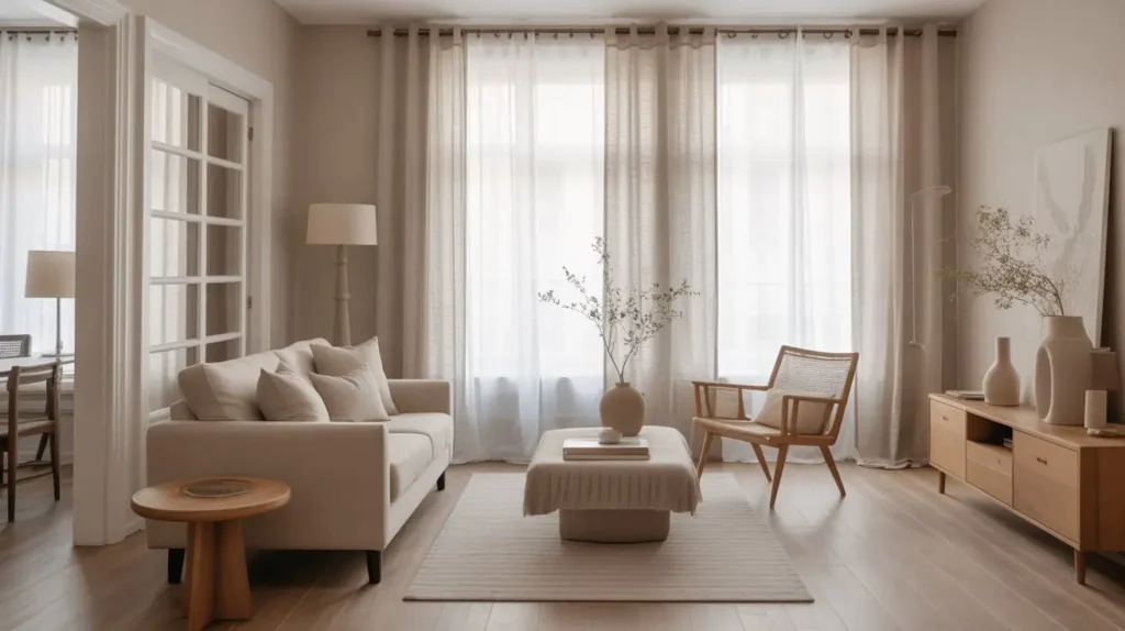 The light wood—whether it’s in your flooring, coffee table, or media console—provides a warm, organic base. The sheer curtains complement this by adding a layer of softness and enhancing the natural light. Together, they create a space that feels bright, clean, and deeply connected to nature.