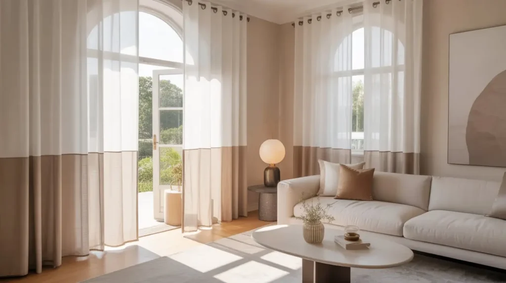 Feeling a bit more adventurous? A two-tone or color-block sheer curtain can be a fantastic way to add a pop of personality and a modern, graphic element to your living room. This design typically features a neutral color (like white or cream) on the top two-thirds of the curtain, with a block of color at the bottom.