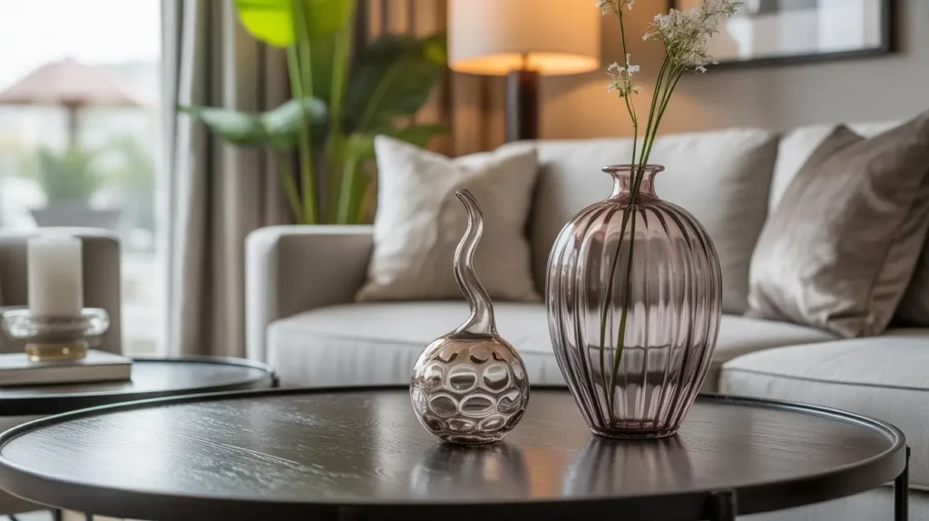 For a look that is light, bright, and utterly sophisticated, turn to glass. A side table styled with glass and acrylic decor creates a sense of openness and airiness. It’s perfect for smaller living rooms because clear objects take up less “visual weight,” making the space feel larger.