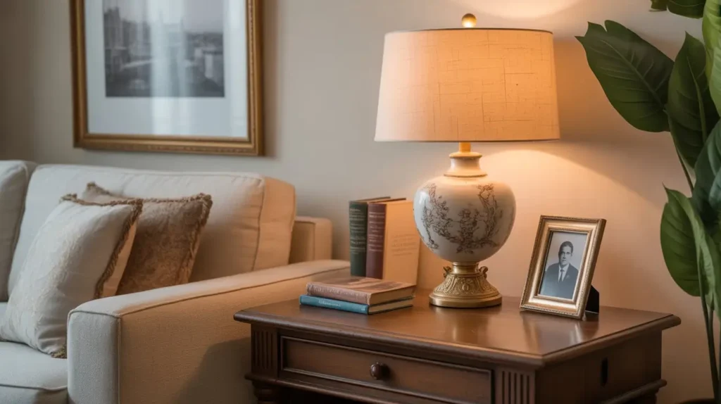 - Vintage Lighting: An old-fashioned pharmacy lamp or a small lamp with a pleated shade.
