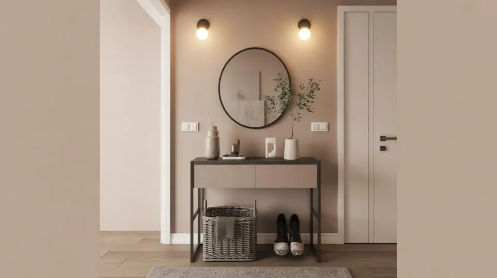 - Complete the Zone: Add a few key elements to make it fully functional. Hang a stylish mirror above the table (great for a last-minute check before you leave) and a few sleek wall hooks for coats or bags. A small, durable rug can also help define the space.