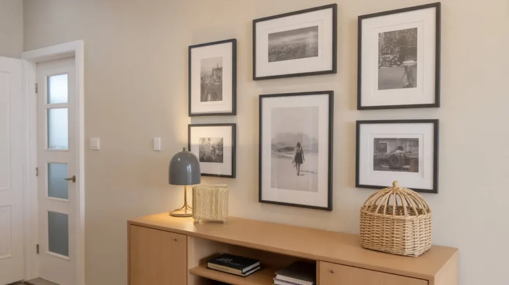 You’re not just hanging pictures; you’re telling a story. It could be a collection of family photos, a series of prints from your favorite artist, or an eclectic mix of art, photos, and even small, flat objects like a beautiful postcard or a decorative plate.