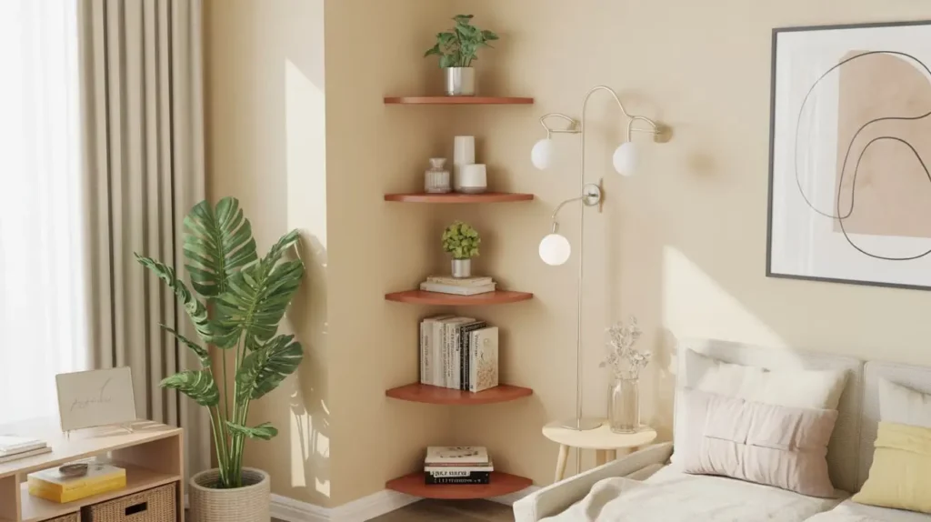 Instead of a single shelf, you install a series of three to five small shelves stacked vertically up the corner. This draws the eye upward, making the ceiling feel higher, and provides multiple surfaces for both decor and function without eating into your precious walkway.
