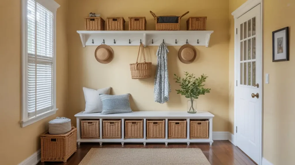 • Vary the Sizes: Use a large, tall basket for umbrellas or yoga mats. Use a couple of medium-sized, open-top baskets for shoes. A smaller, lidded basket could sit on a bench or shelf to hide away smaller items like gloves and hats.