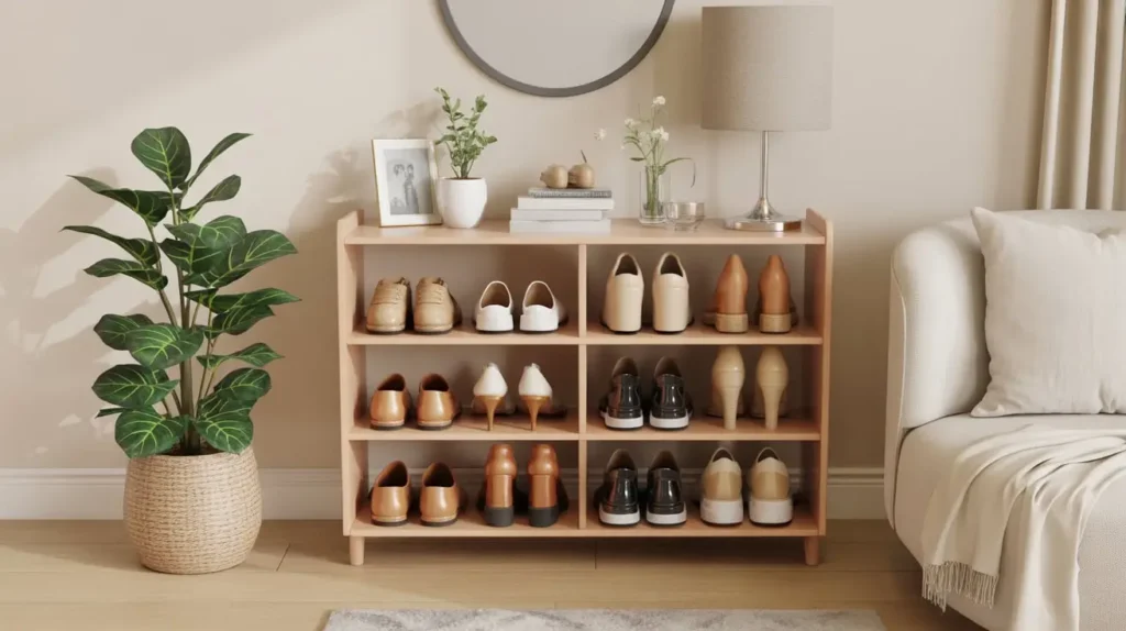 Look for slim, vertical shoe racks that make the most of height. Some of the best designs are wall-mounted, appearing to float off the floor, which again, helps with that open, airy feeling. Another brilliant option is the “tipping bucket” shoe cabinet—these are incredibly slim (often only 6-8 inches deep) and hide your shoes away completely behind neat little doors.