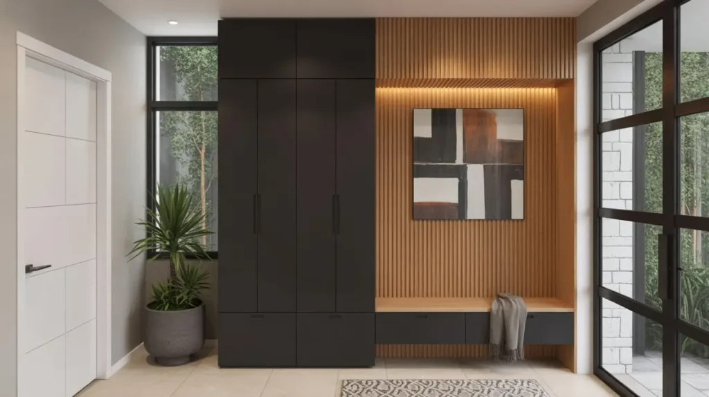 • The Furniture Focus: Keep the walls white or light gray, and let the furniture do the talking. A sleek black console table paired with a mirror framed in natural wood looks incredibly sharp. Or, a wooden bench with black metal legs.