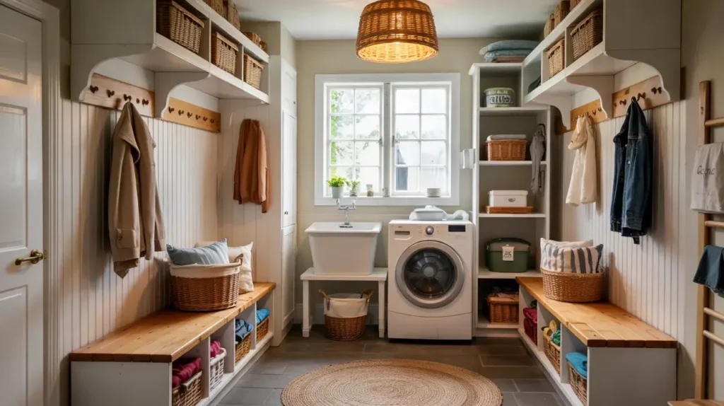 I combined my laundry area with mudroom functionality, and it genuinely makes life easier. You’re already dealing with dirty stuff—might as well handle dirty clothes AND dirty shoes in one spot, right?