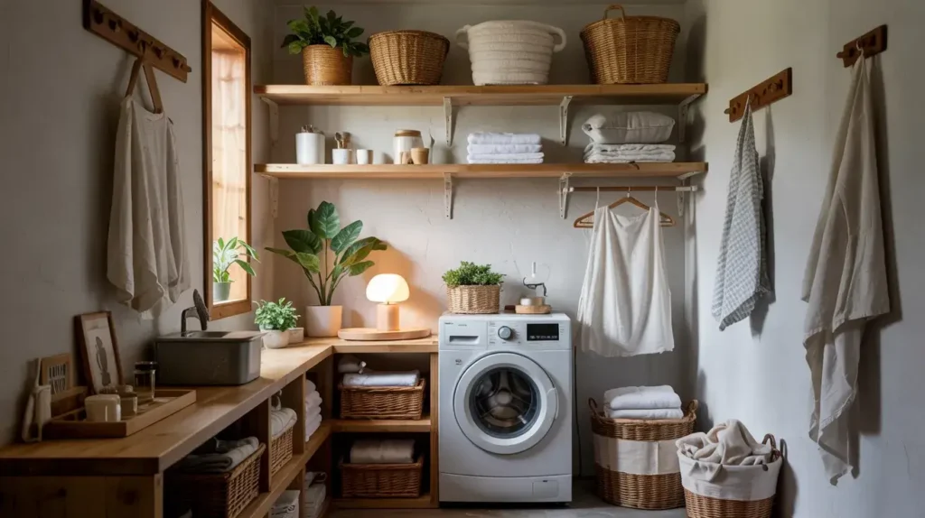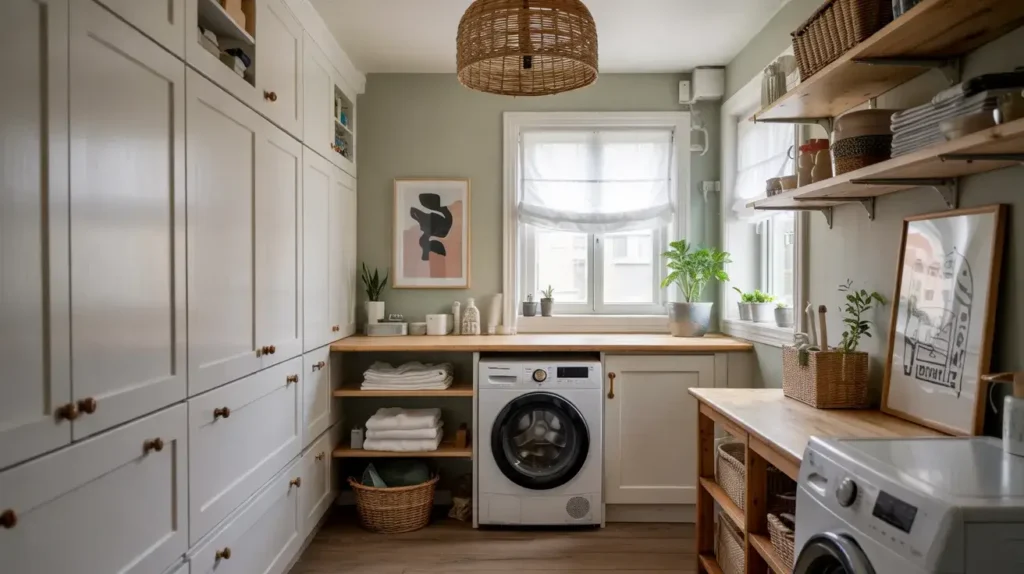 Here’s the ultimate small-space strategy: make every element do double or triple duty. Multi-function furniture and storage solutions are the secret weapon for tiny laundry areas.