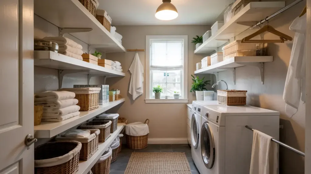 Think about workflow, too. Put your hamper at the entrance, washer and dryer next, then your folding area, and finally your storage at the far end. This creates a natural flow from dirty to clean to organized.