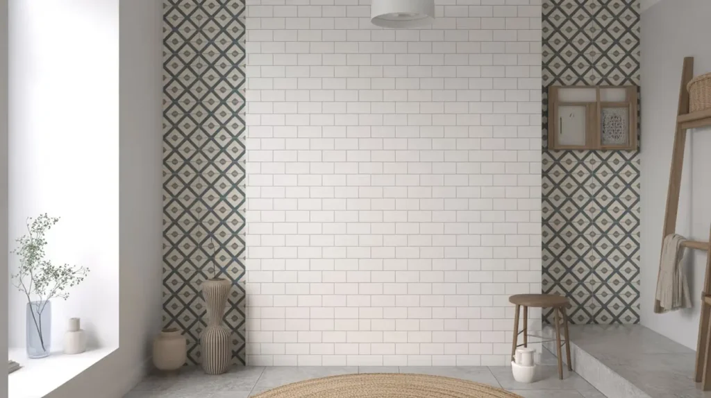 • Framed Art: Use a contrasting tile color or pattern (like herringbone) to create a “frame” on the wall, with a simpler pattern inside. This is a great way to highlight a specific area, like the space above the bathtub.