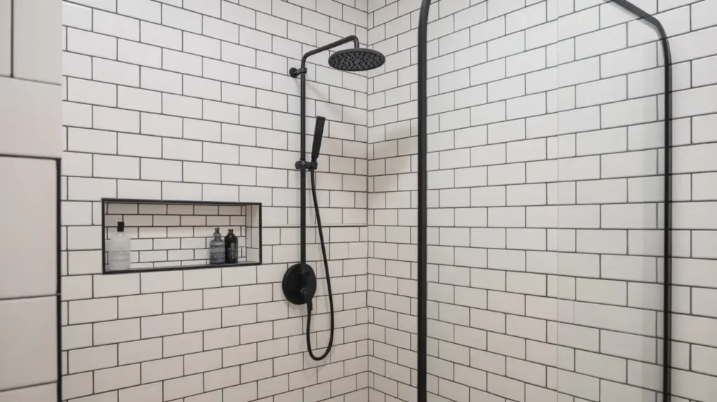 • Simple Fixtures: Choose a showerhead and handle with a simple, elegant design. A single-function rain showerhead in a matte black or brushed nickel finish works perfectly. The goal is to let the clean tile work be the hero.