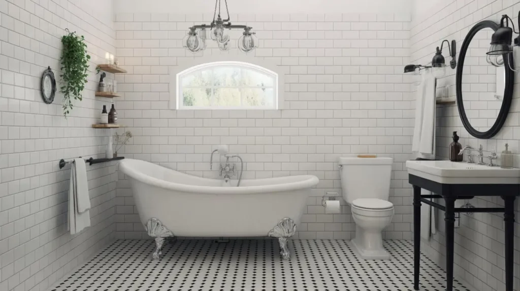 • Black and White Palette: A classic black and white color scheme is the foundation of many vintage bathrooms. Think white subway tile on the walls and a black and white patterned tile (like a hex or basketweave) on the floor.