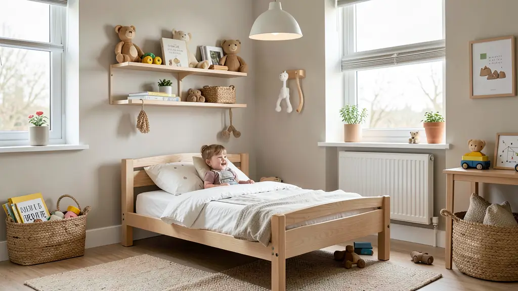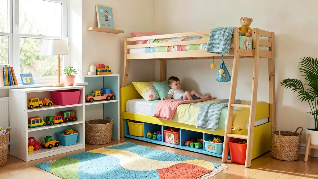 Vertical storage becomes your best friend in small spaces. Think wall-mounted shelves, over-the-door organizers, and bed storage that actually works. The goal is keeping the floor clear for play while maximizing every square inch.
