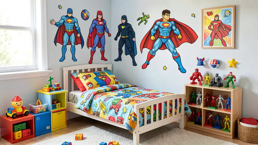 The color scheme depends on your child’s favorite heroes, but bold primary colors typically dominate. Red, blue, yellow, and green work together to create that classic comic book feel.