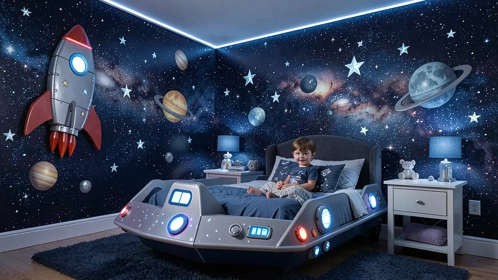 Ready for blast off? Space themes capture that sense of wonder and infinite possibility that toddlers naturally possess. I’ve watched kids spend hours “flying” around their space-themed rooms, and honestly, it never gets old.
