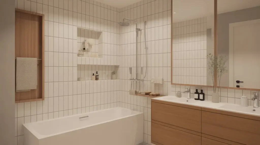 I love this look for creating a “Japandi” vibe—that beautiful blend of Japanese minimalism and Scandinavian function. The vertical tile brings the clean, modern lines, while the wood introduces a natural, calming element. It’s a sophisticated pairing that feels grounded and serene. It’s a space you actually want to unwind in, not just rush through.