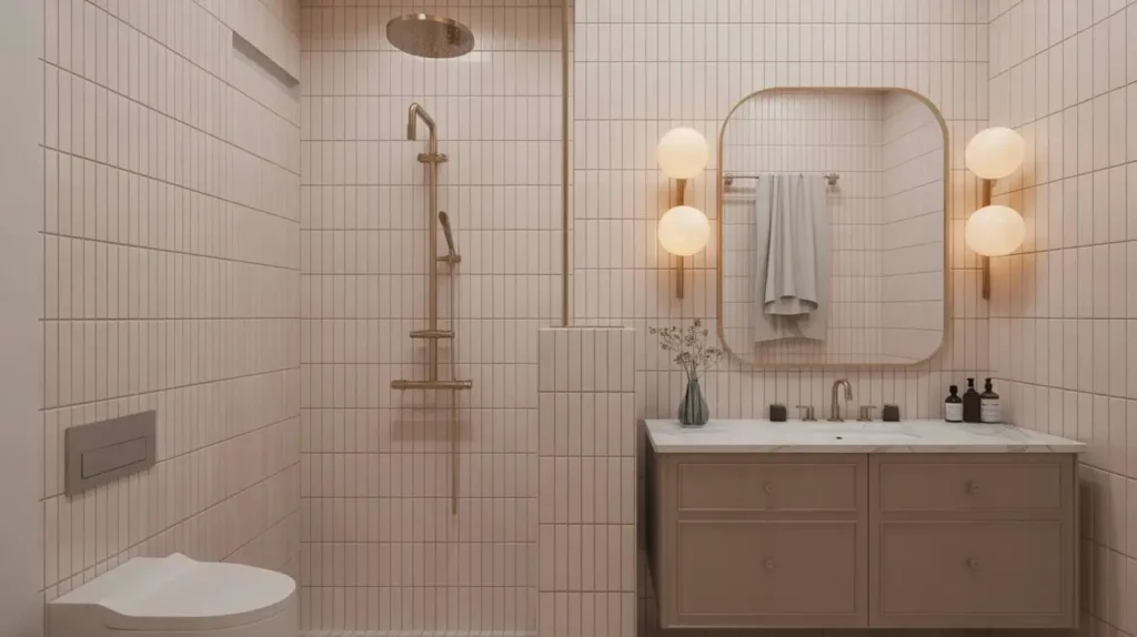Let’s talk about adding a little bit of glamour. If matte black feels too industrial for you, but chrome feels a little too… standard, then warm metallic fixtures are your answer. Pairing a neutral vertical tile with brushed gold or champagne bronze fixtures is the perfect way to add a touch of warmth, luxury, and personality to your bathroom.