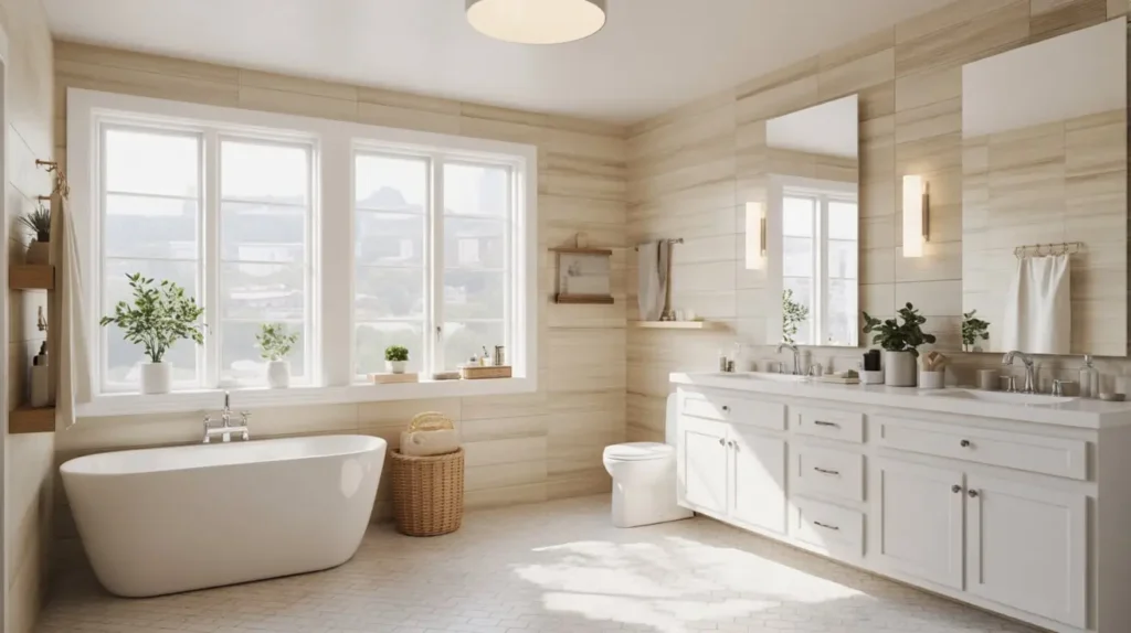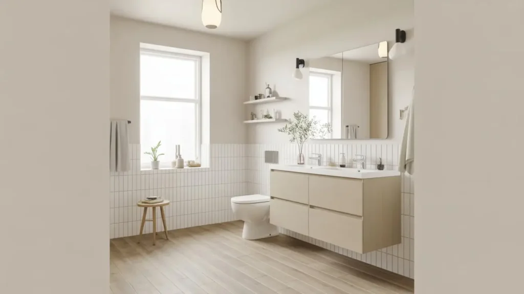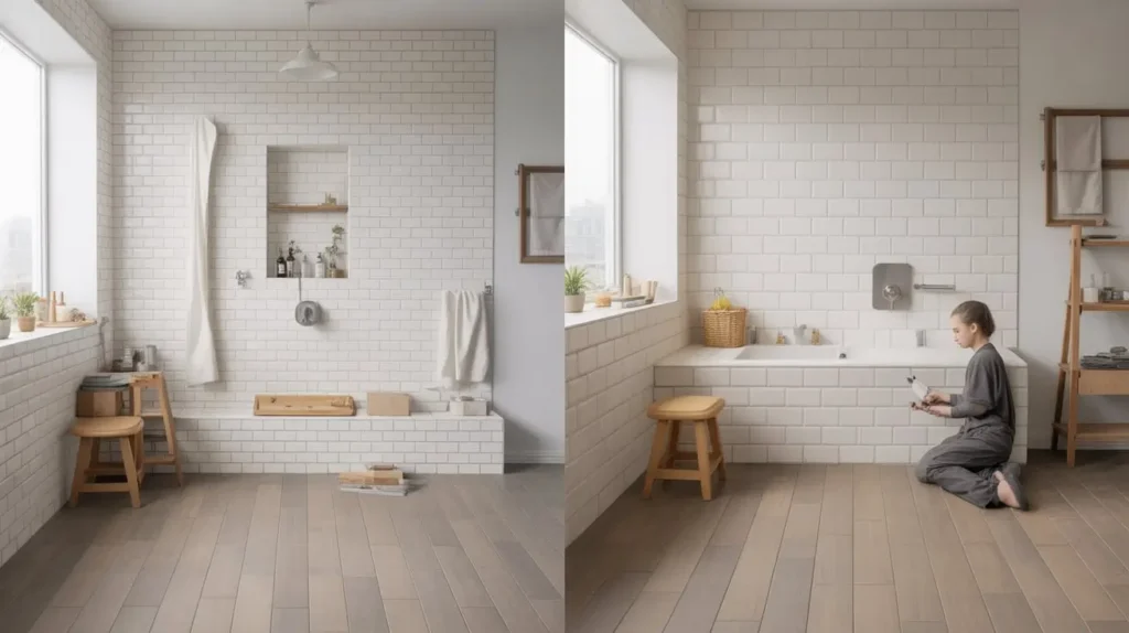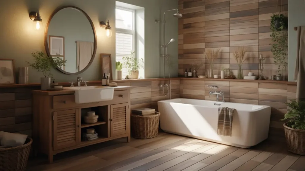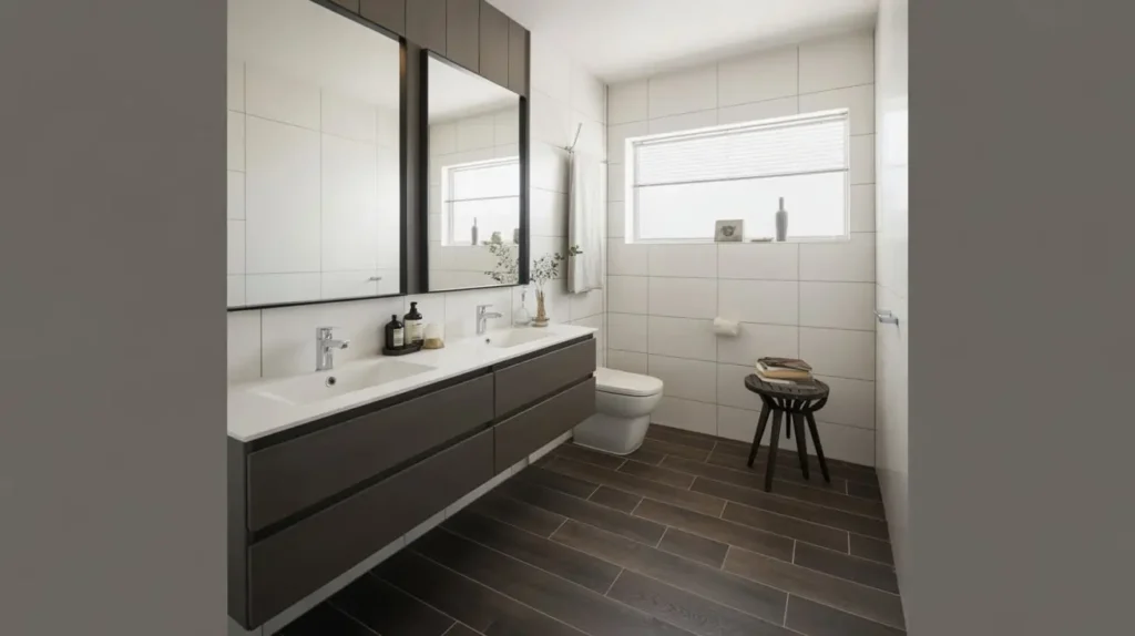 • Focus on One Feature: Instead of a full overhaul, create one “wow” moment. Use a slightly more expensive wood tile to create a feature wall behind the vanity and keep everything else simple.