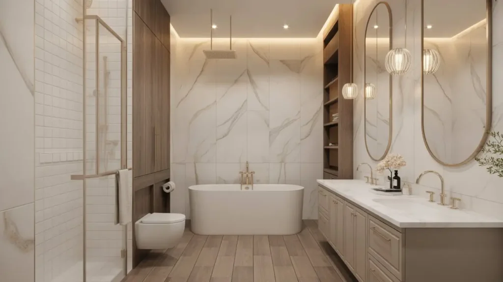2. Marble Floors with a Wood Tile Accent Wall: Flip the script. Use a polished marble tile on the floor and then create a stunning feature wall with wood tile. This works especially well in the shower or behind the vanity. The wood tile breaks up the potential coldness of an all-marble room and adds a necessary touch of warmth.
